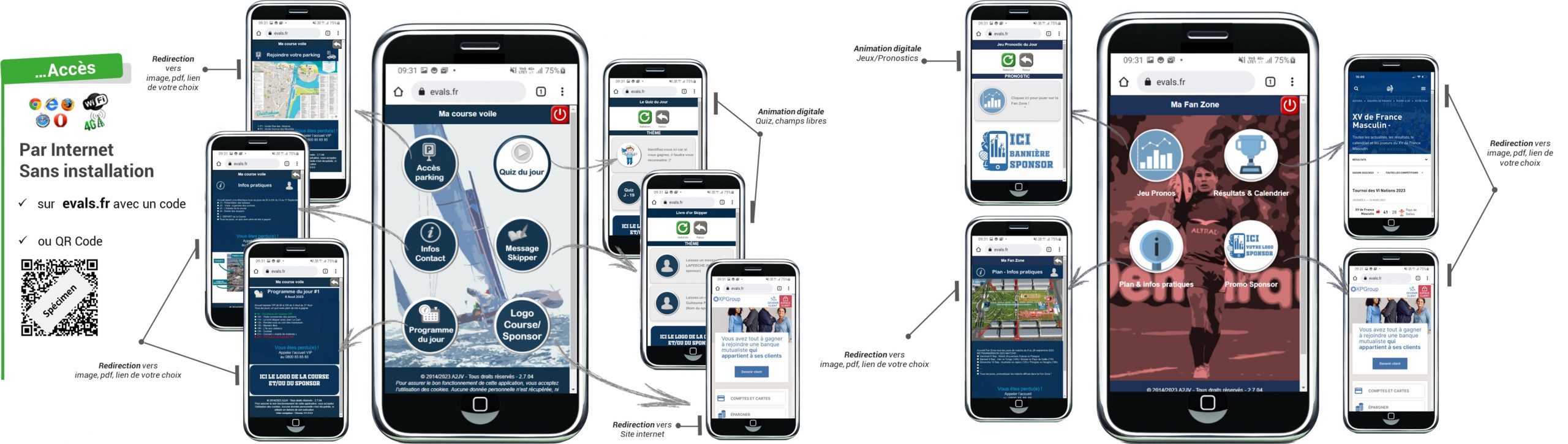 Evals&Sport n’est pas une énième application mobile mais bien une solution digitale SIMPLE et ACCESSIBLE pour tous, sans application à télécharger pour faire jouer/sonder vos visiteurs et vos compétiteurs sur un portail interactif 100% personnalisable à vos couleurs ! En proposant une nouvelle visibilité innovante à vos sponsors et exposants.